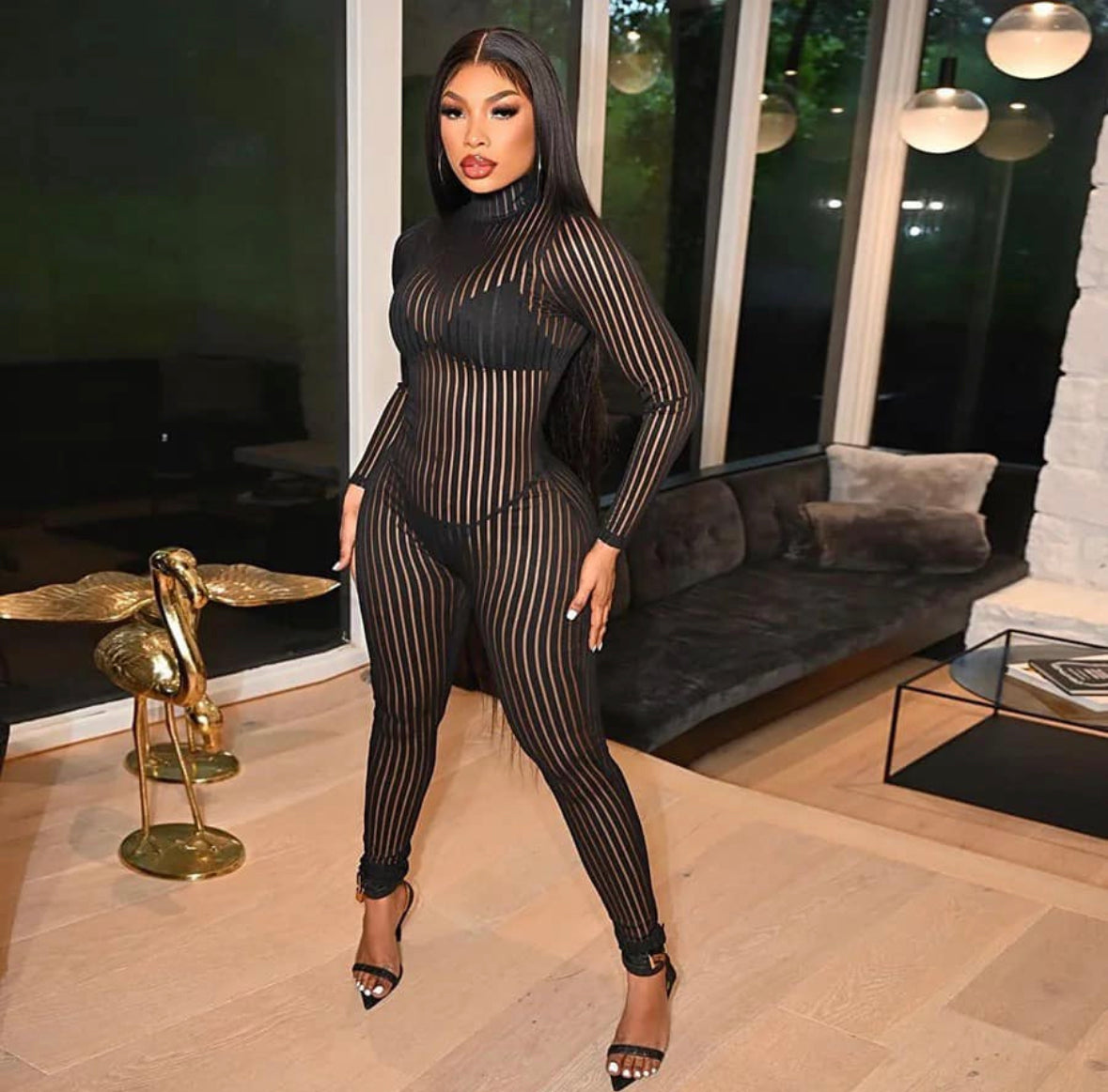 Make a striking entrance in this daring pinstripe sheer mesh jumpsuit. This form-fitting one-piece is a perfect blend of edgy and chic, designed to accentuate your silhouette. The all-over sheer mesh fabric is detailed with vertical opaque stripes, creating a captivating pinstripe effect that elongates the body. With a stylish mock neckline and long sleeves, this jumpsuit offers a sleek, sophisticated look. It's the ultimate statement piece for a night out, a party, or any event where you want to stand out from the crowd. We recommend styling it with your favorite lingerie set or bodysuit underneath for a confident, show-stopping ensemble.