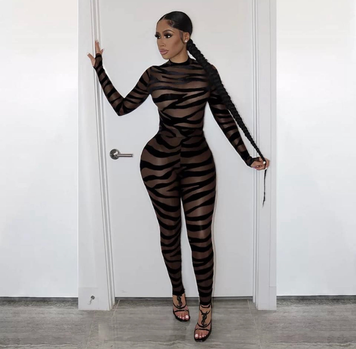 Unleash your inner feline with the "Wild Cat" Suit, the ultimate statement piece for a night of untamed fun. This show-stopping catsuit is a masterful blend of exotic print and daring sheerness, guaranteed to make you the center of attention.